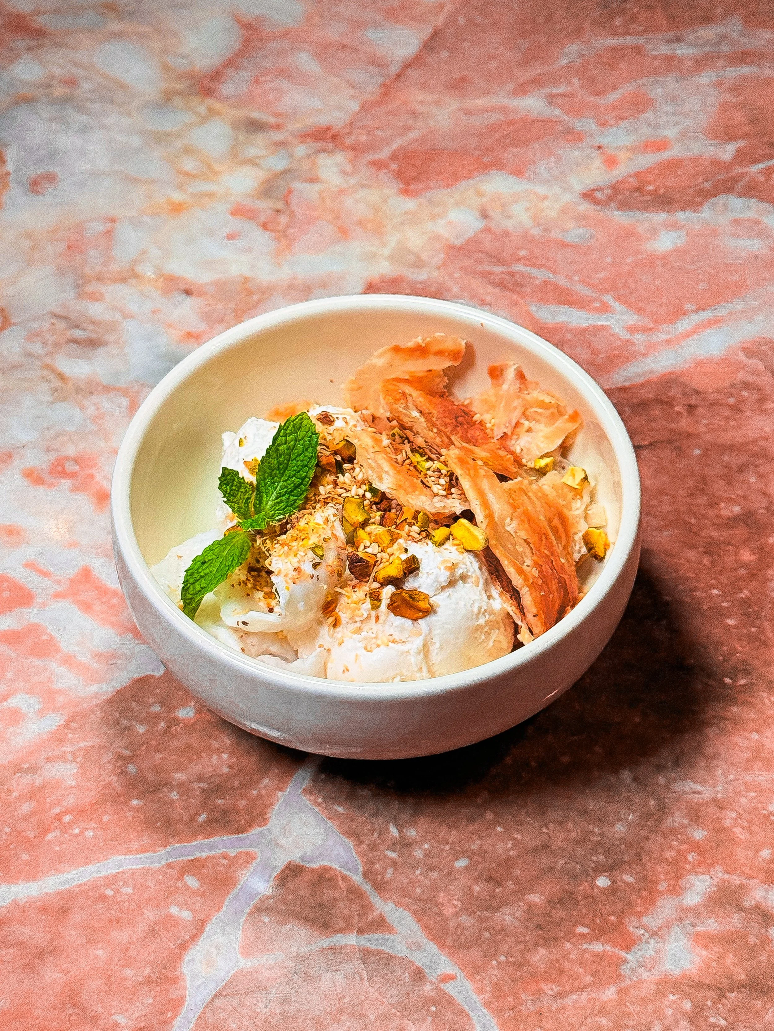coconut milk ice cream with young coconut, pistachios, toasted coconut, white sesame, and Thai-style roti